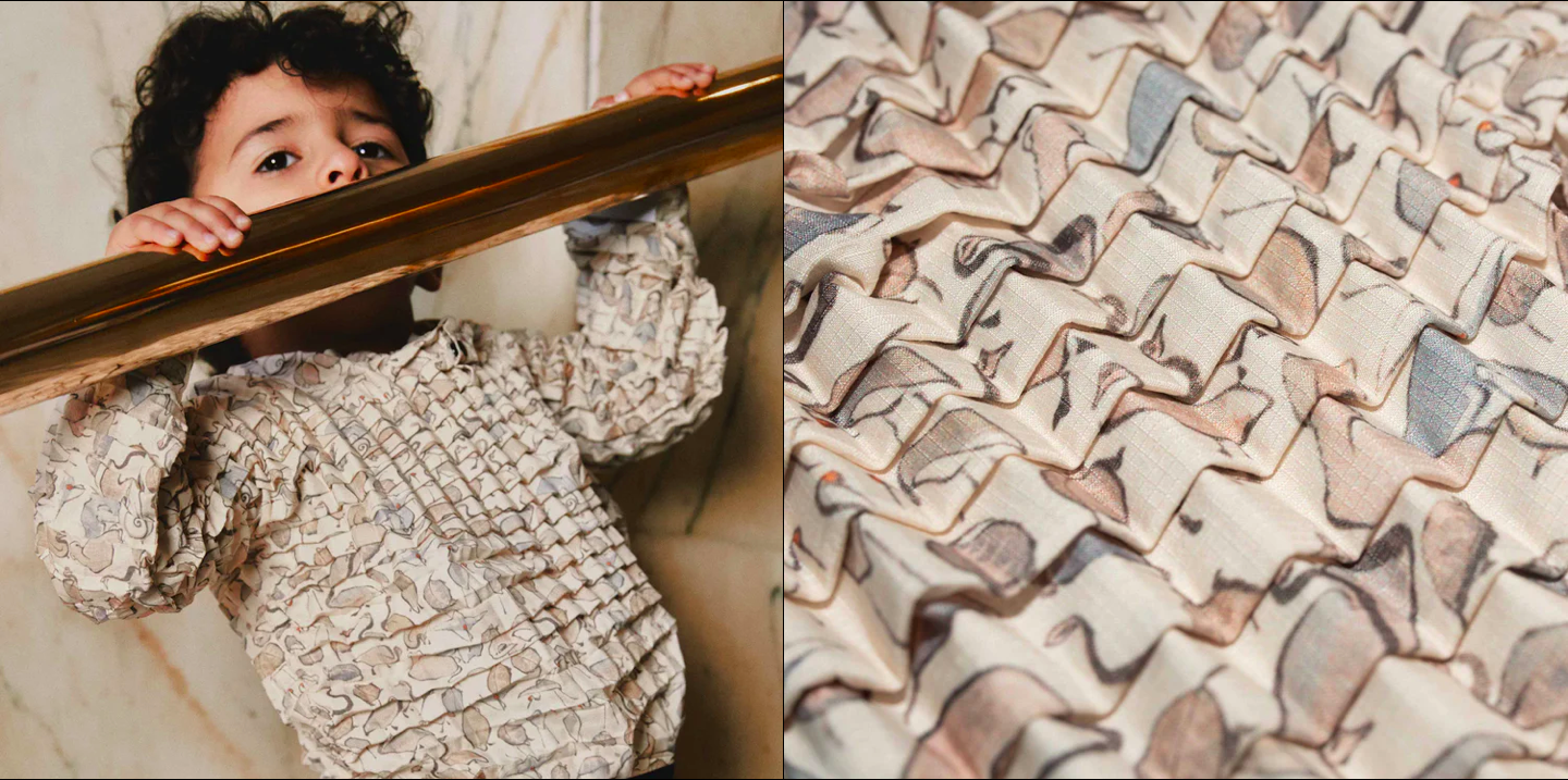 Gracias a su estructura plisada, el innovador material utilizado por Petit Pli puede expandirse hasta siete veces su tamaño inicial, adaptándose a los cambios del cuerpo a lo largo de los años.